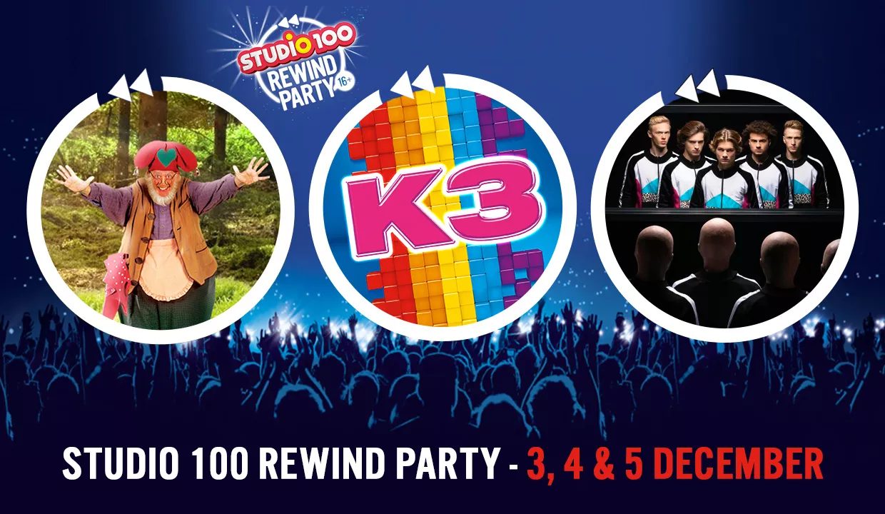 LET OP: de Studio 100 Rewind Party op 4 & 5 december is reeds uitverkocht. Voor 3 december zijn er nog een beperkt aantal tickets beschikbaar via https://studio100.com/rewindparty