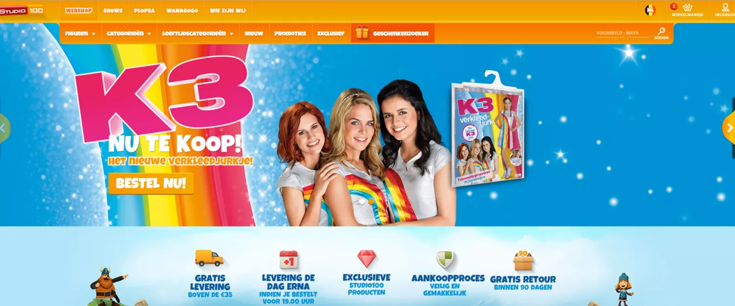 Op de officiële Studio 100 Webshop vind je het ruimste online assortiment aan boeken, multimedia, merchandising, kleding en nog veel meer van de kindermerken Mega Mindy, Maya, Heidi, K3, Ghost Rockers, Prinsessia, Samson & Gert, Bumba, Rox, Piet Piraat en Kabouter Plop bestemd voor een leeftijd van 0-12jaar.