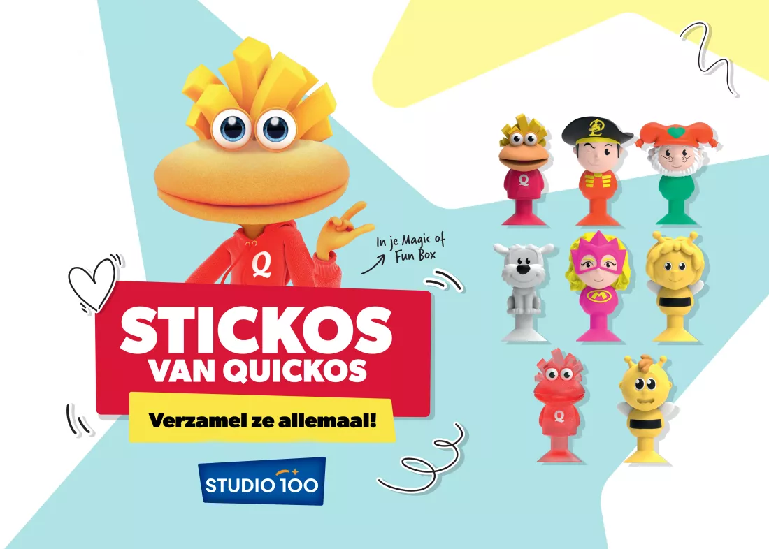 Verzamel van 10 februari tot en met 6 april de allerleukste Stickos van Quickos! Ontdek één van de 8 figuurtjes in je Magic Box of Fun Box bij Quick.